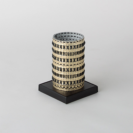 アクリル製の円筒に対して、隙間、たるみなどができないよう、革を伸ばしながら少しずつはめ込むことで、一体感を出しています。