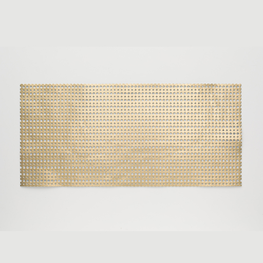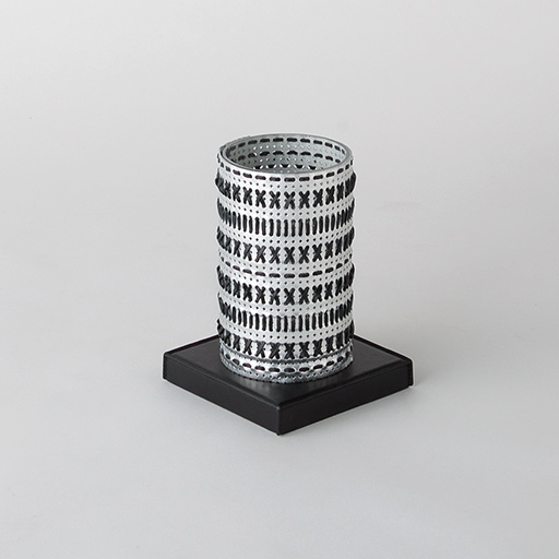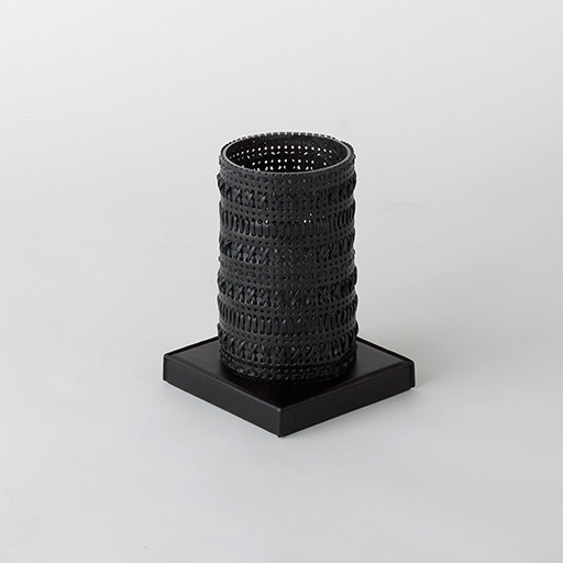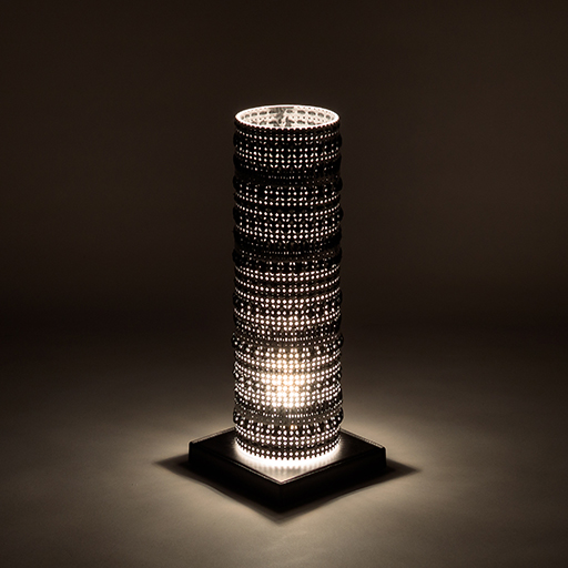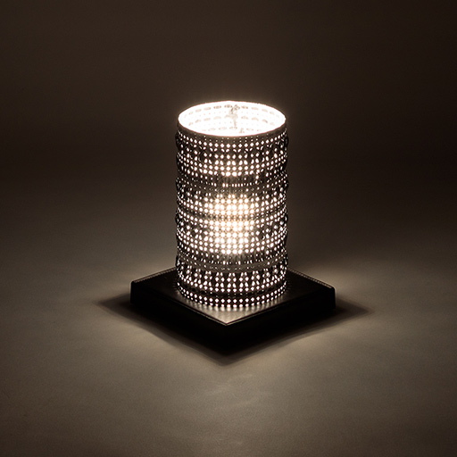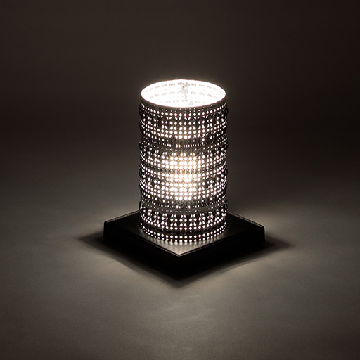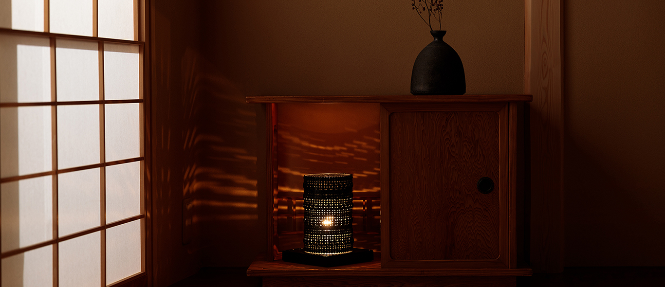 無数に穴を開けた革のプレートに異なる編み方で革紐をとおすことで、ランプシェードに様々な表情を加えています。無数に開けた穴からあふれる「木漏れ日のような柔らかい光」は、落ち着きのある空間へと、神秘的に変化させます。